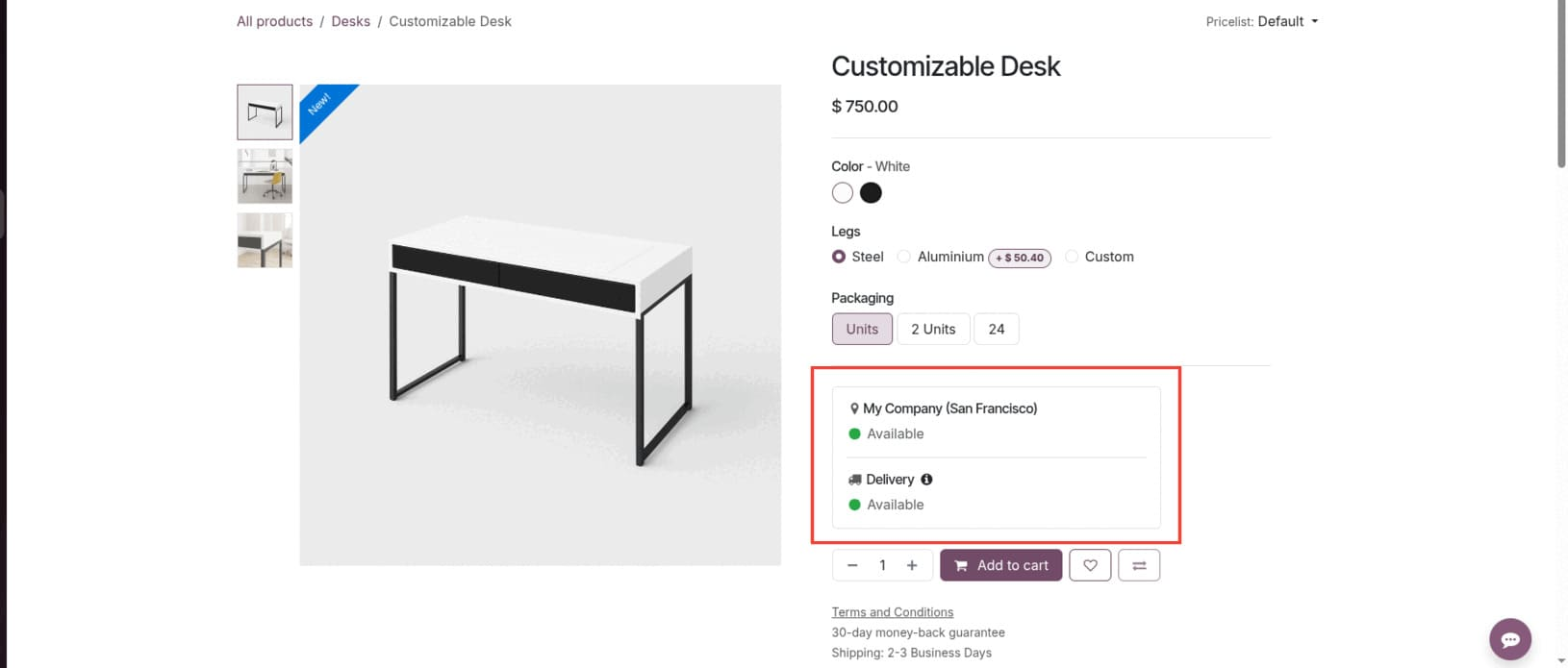 La última actualización de Odoo 19 introduce una emocionante mejora en su plataforma de comercio electrónico con un nuevo panel de inventario, integrando sin problemas la ubicación de la empresa, el estado de disponibilidad y las opciones de entrega justo al lado del botón "Añadir al carrito".